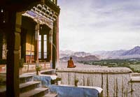 OK. One killer day – this will be a 10 hour or so drive. But fabulous! This road is famous as one of the highest motorable roads in the world, and this morning you will cross its highest point, the 17,450 ft Taglang La. As you descend into the valley of Ladakh, we will catch our first glimpse of the Indus river, just a small stream here, fresh from the slopes of Mt. Kailash. There are more settlements, now that the altitude has come down to about 12,000 ft. and the remaining drive into Leh is full of small farms, chortens, mani stone walls, and graceful fluttering prayer flags.
